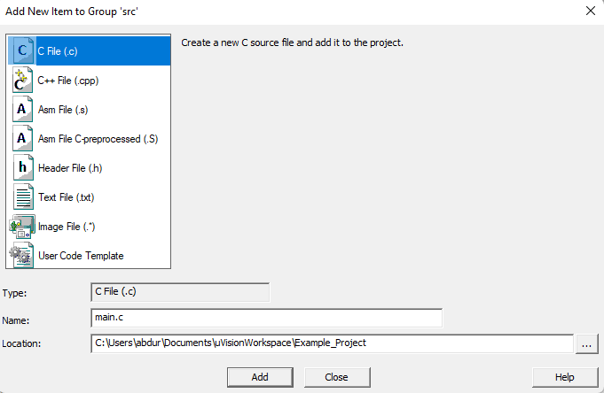 Last object is creating main.c file for codding. For this; right-click “src” folder then click “Add New Item to Group” then choose C File name it main.c then click OK.